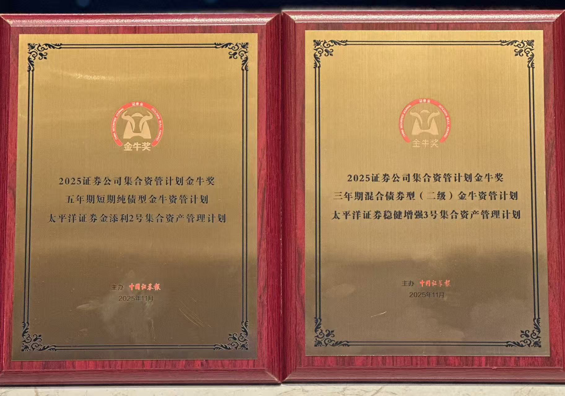 2025年11月8日,太平洋证券在中国证券报主办的“中国证券业金牛奖”评选中成功斩获“三年期混合债券型(二级)金牛资管计划”与“五年期短期纯债型金牛资管计划”两项大奖!